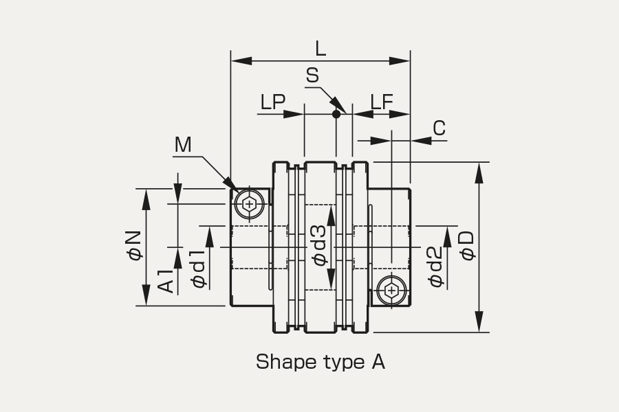 | Model | Typ | d1 Min. | d1 Max. | d2 Min. | d2 Max. | D | N | L | LF | LP | S | A1 | A2 | C | d3 | K | M | Nm Low dust | Nm Fluorine |